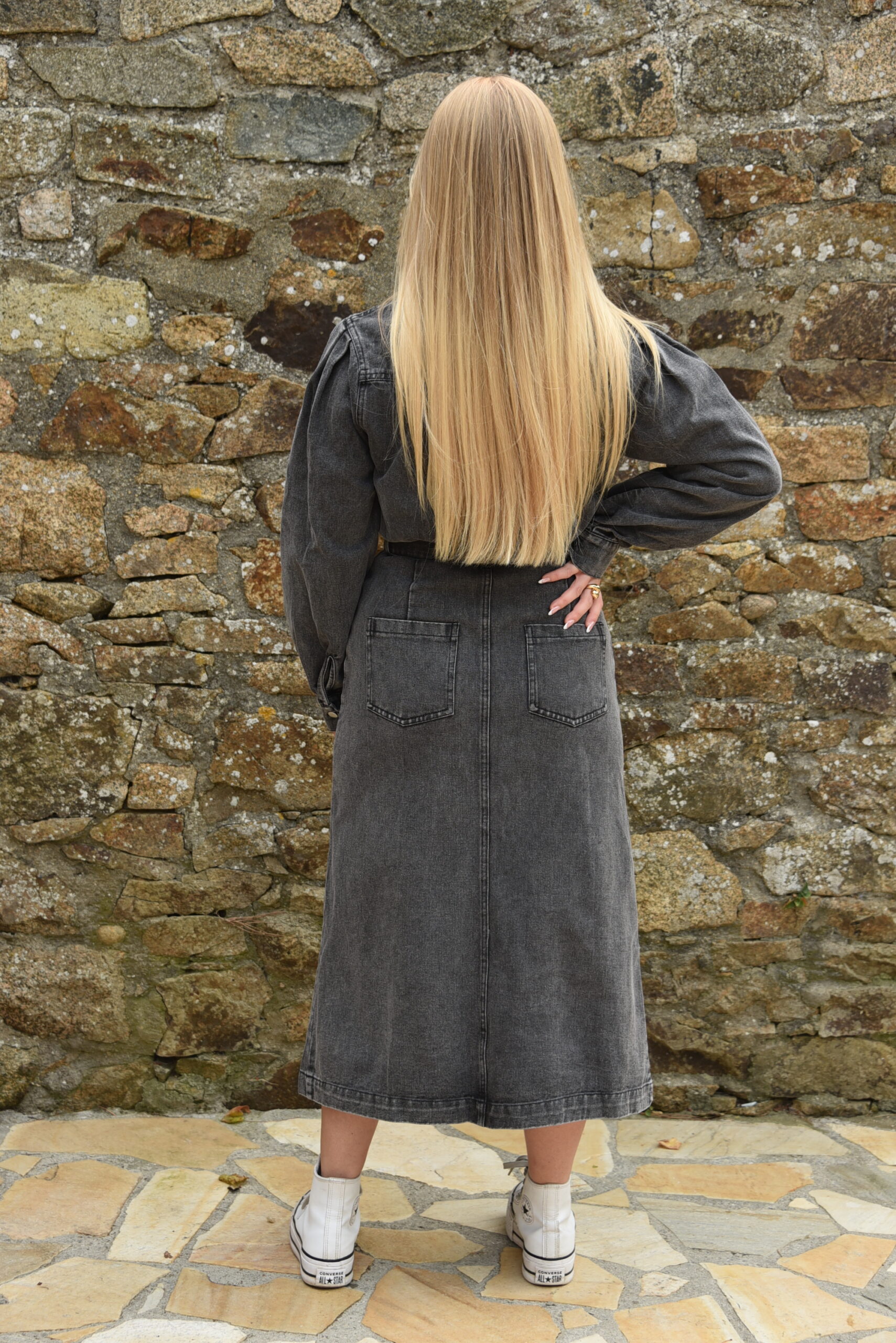 Robe en denim 100% coton, idéale pour l’hiver, allie confort et style.
