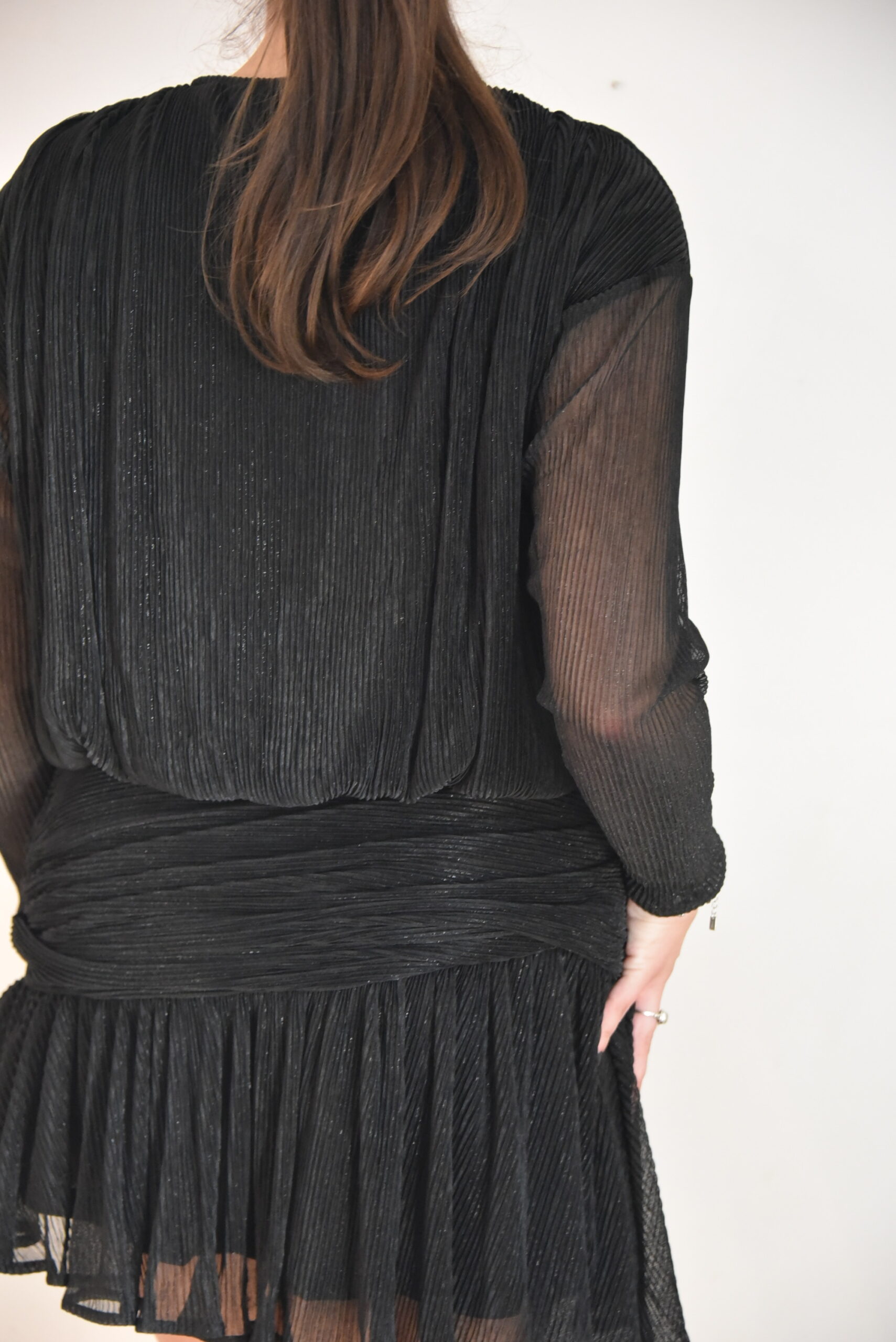 Robe  Elsa en maille recouverte de sequins. Coupe ajustée avec drapé au niveau de la taille et volant asymétrique en bas de jupe. Encolure ronde, manches longues et épaules structurées avec épaulettes intégrées. Fermeture goutte au dos avec bouton.